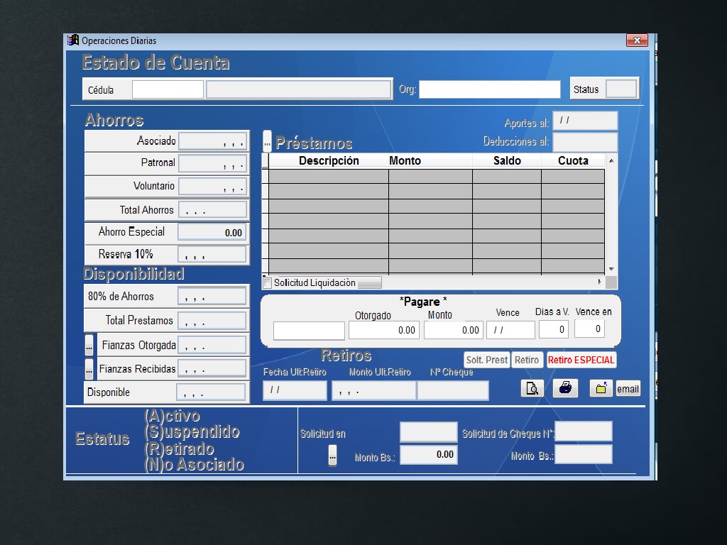• Para los asociados:Registro, solicitud de prestamos, retiros parciales, totales, estado de cuenta